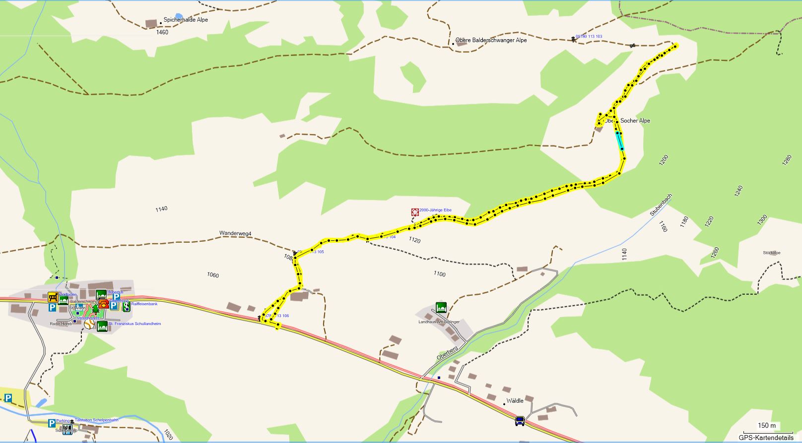 Die Blaue Route fährt einen Bogen nach Osten. Man landet ca. 800 m östlich der Talstation an der Ostrach und wandert auf einem schönem Weg zurück.