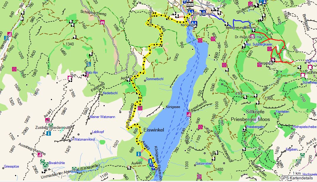 Schönau/Königssee - Bootsfahrt nach Salet - Sagereggsteig - Grünsee - Kärlinger Haus (Übernachtung) - Saugasse - Sankt Bartholomä - Bootsfahrt zurück nach Schönau/Königssee.