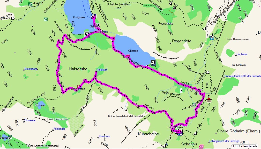 Start Schönau/Königssee - Bootsfahrt nach Salet - Kaunersteig - Regenalm - Landtalsteig - Wasseralm (Übernachtung) - Röthsteig - Salet - Boot nach Schönau/Königssee.