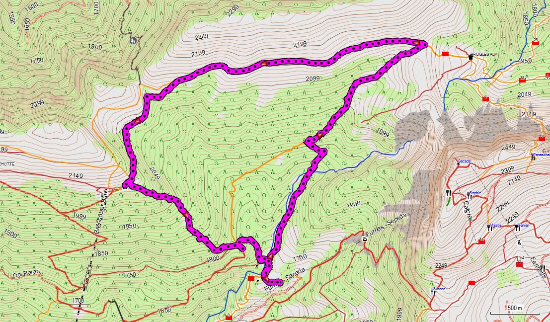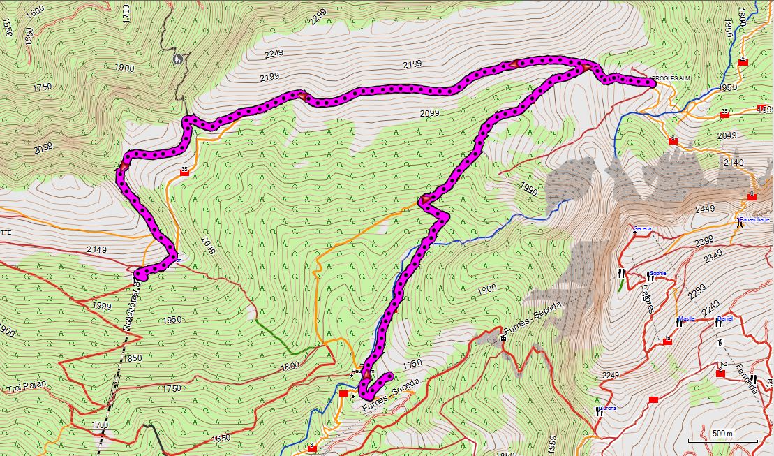 Bus > Sellajoch. Friedrich-August-Weg > Plattkofelhütte (2:30) > Langkofelscharte > Monte Seura (+ 2:30) > Seilbahnabfahrt: Höchste Wegstelle Plattkofelhütte (2300 m). +430/-540 hm, 13 km, 5:00 h. Achtung: letzte Talfahrt je nach Saison evtl. 16:45 h!