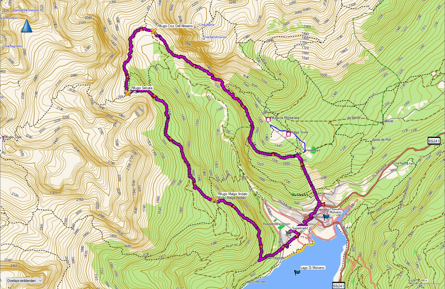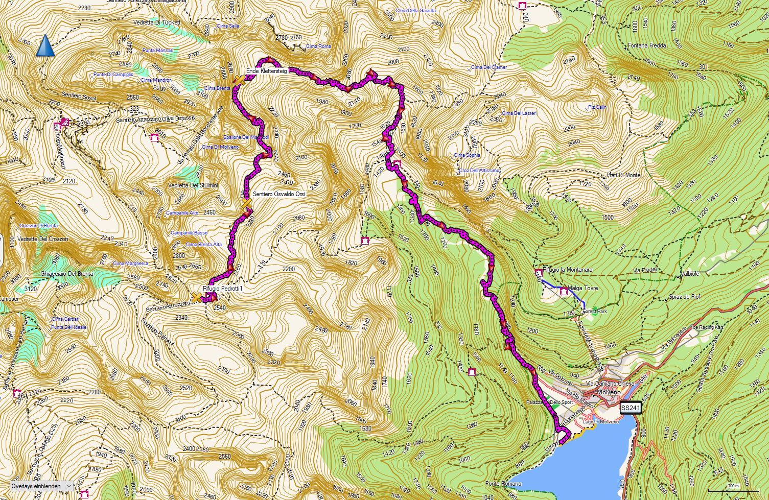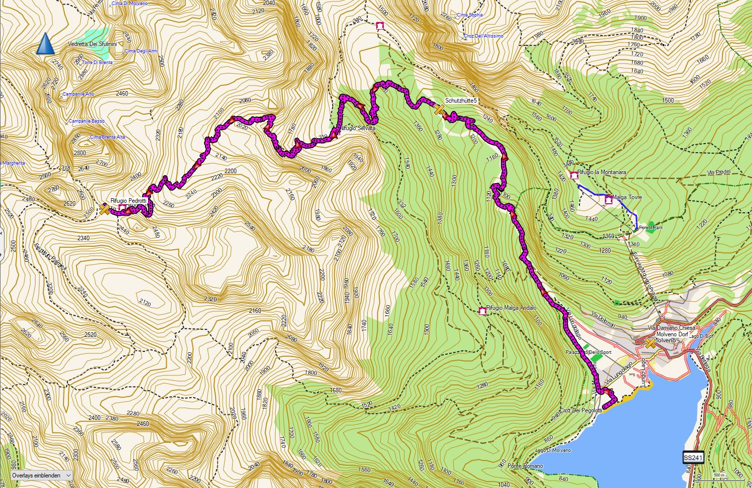 Die Höhemmeter betragen +1000/-1200 hm und die Strecke ist 15 km lang. Man startet in Molveno und folgt teils guten Wegen, teils Bergpfaden und Steigen. Trittsicherheit ist erforderlich. Einkehren und Übernachten kann man in der Malga Spora und im Rif. Croz dell´Altissimo.