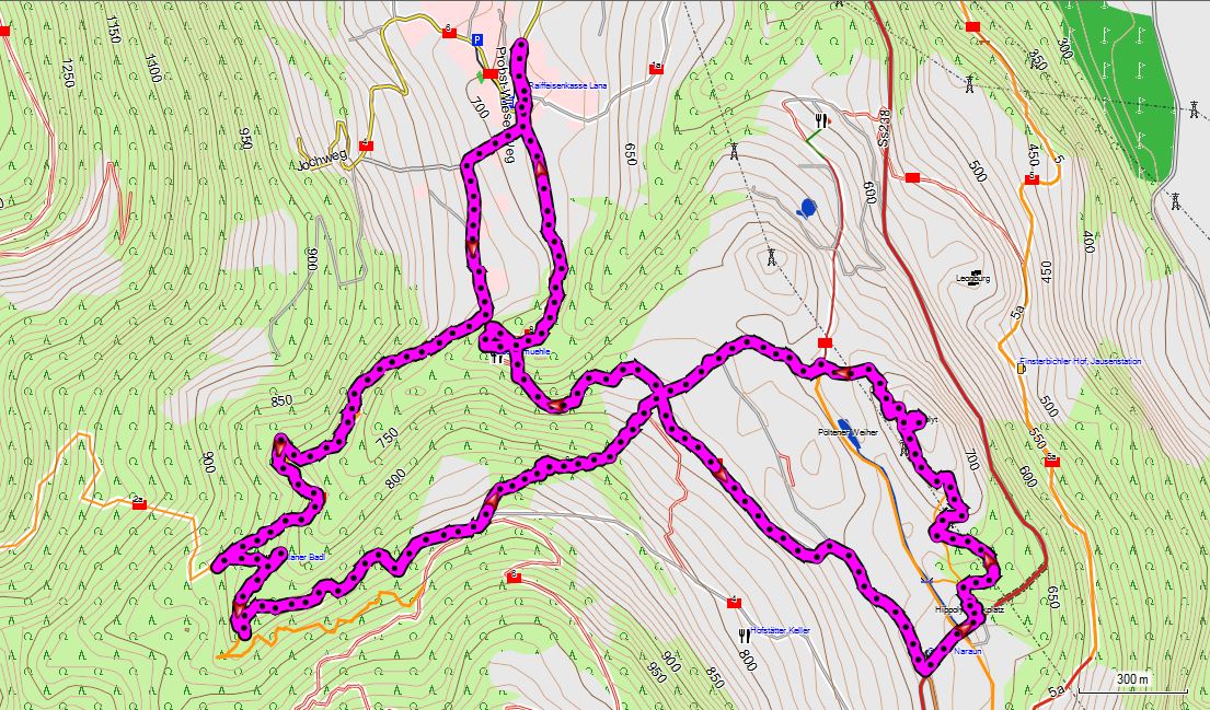 Gehzeit 2:00 h, Strecke 7 km, Höhenmeter +300/-350 hm. Die Tour ist überwiegend schattig. Bei Nässe ist der Abstieg etwas mühsam.