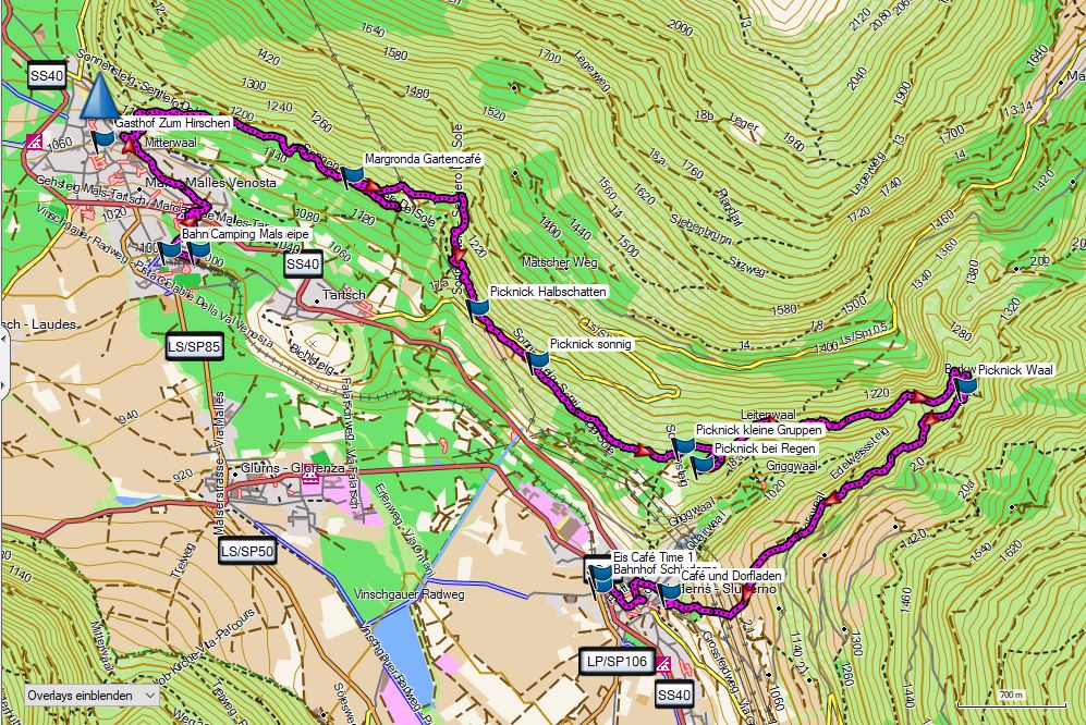 Start an der Straße ins Ultental (Bushaltestelle Vigilhof) - etwas unterhalb in der Kurve Einstieg in den Waalweg - Richtung Haiderhof - Wege 33b und 33a - Marlinger Höhenweg - kurz vor Senn am Egg über 35 runter - Marlinger Waalweg - Tschermser Waalweg - Lana. +500/-600 hm, 14 km, 4:30 h. Von der Leitenschänke zum Bus in Lana 0:30 h.