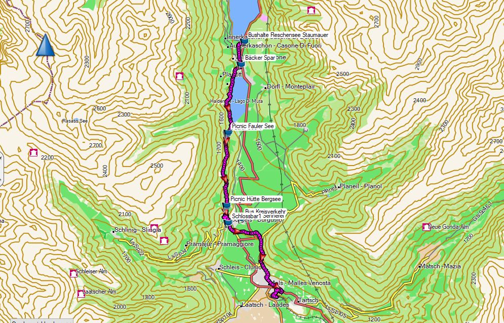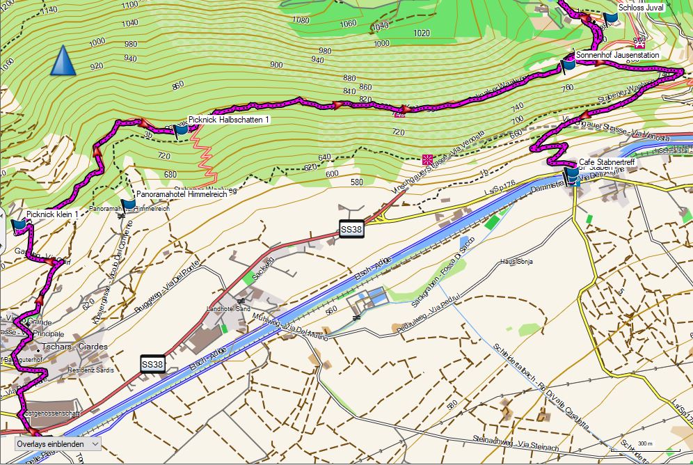 Auf der Höhenstraße von Tappein geht es über Weg Nr. 7 zur Schlandersburg und über den Ilswaal nach Kartsch und Schlanders. In Schlanders kann man am Bahnfhof gut zu Getränken einkehren und mit dem nächsten Zug nach Latsch zurück fahren.