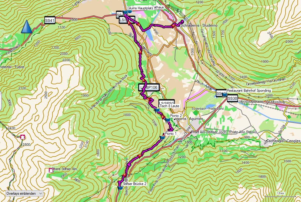 Vom Bahnhof Spondinig fährt stündlich ein Bus zum Start an der Stilfser Brücke. Zurück kommt man mit dem Zug ab Schluderns.