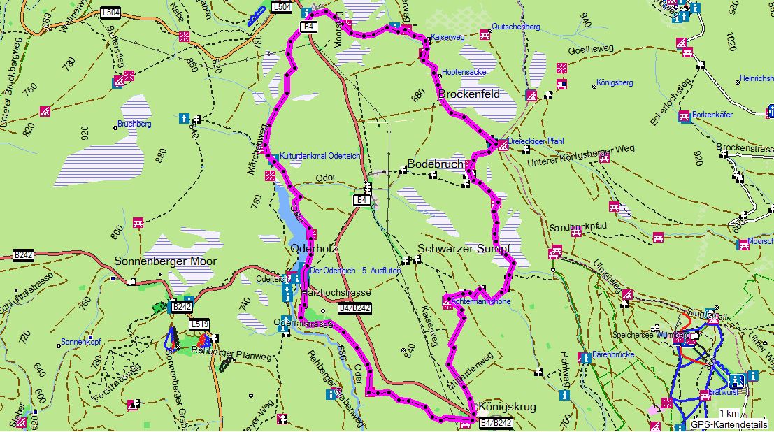- Route: Königskrug - Achtermann - Rotes Bruch - Bodebruch - Dreieckiger Pfahl - Torfhaus - Märchenweg - Oderteich - Königskruger Planweg - Königskrug