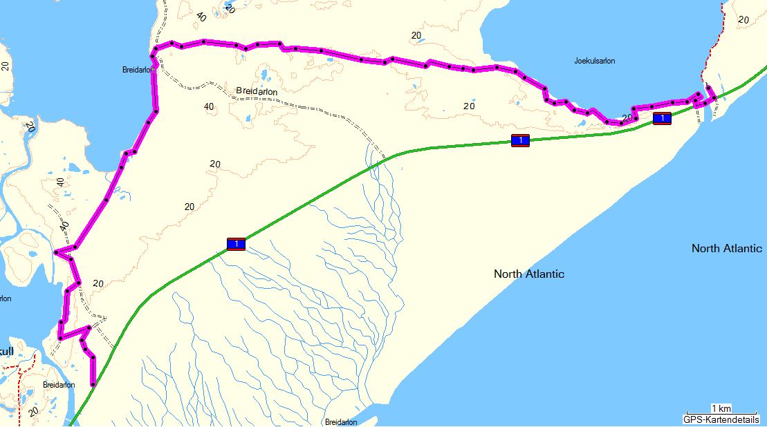 - Streckenwanderung von der Ringstraße (an der Fjallsá-Brücke) über den Breidarlon (Ostufer) zur Ringstraße bei Jökulsárlon