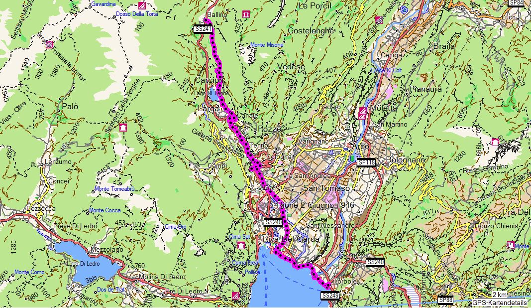 Von Ballino (Start von Riva kommend hinter der Kirche rechts) über den schönen Tennosee (mit Badestelle) und das kompakte mittelalterliche Dorf bis kurz vor Riva.