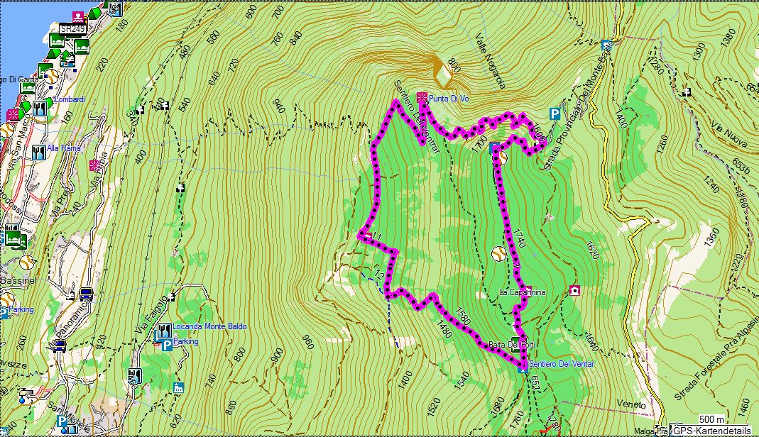 Details siehe auch Tempesta - Torbole und Sentiero Panoramico. Keine Einkehr außer am Start/Ziel, guter Rastplatz auf dem Gipfel bei Malga Zures nach ca. 2:00 h.