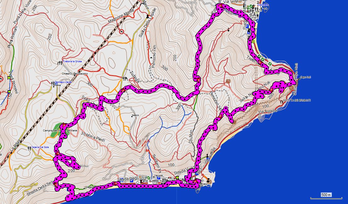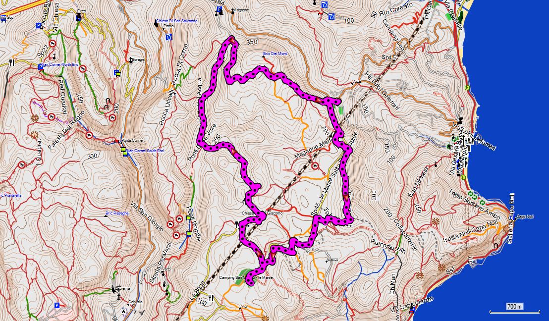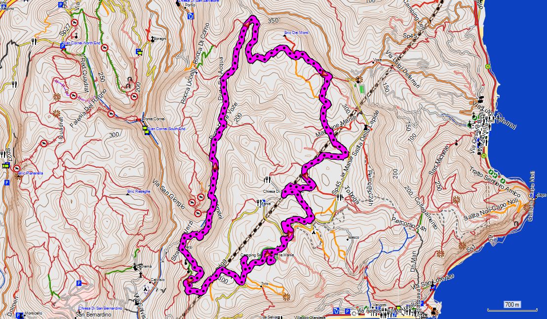14 km, +/-470 hm, 4:30 h. Wanderwege teils durch Wald und teils über aussichtsreiche Rücken. Super Blick auf die Küstenorte Noli und Spotorno.