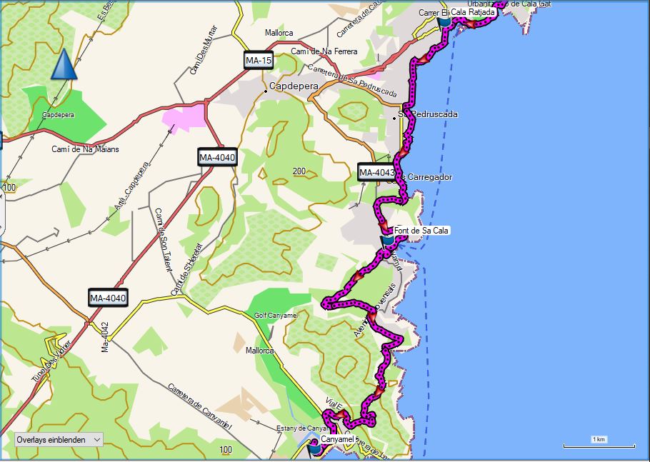 Dann wieder kurz auf demselben Stück zurück, dann aber weiter geradeaus hinab auf die verfallene Hütte zu halten. Von der Hütte aus wird der Weg deutlicher und auch etwas moderater. Die Punkte sind jetzt rot. Der Pfad führt auf eine Straße, und diese nach Canyamel hinein.