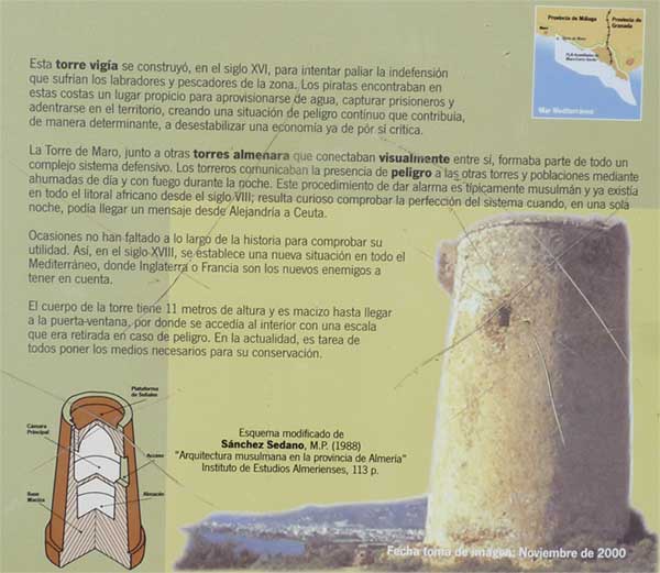 In diesem kleineren Ort - zu Nerja gehörend - liegen die Höhlen (s.o.). Vorläufer von Maro war die römische Siedlung Detunda, von der Reste gefunden wurden. Andere Ruinen stammen von alten Zuckerfabriken, die ab 1600 boomten. Unterhalb des Ortes liegt die Badebucht von Maro. Die Strandkneipe hat wieder offen (s.u.). In der Saison gibt es Kayaks und Liegestühle zu mieten. Östlich oberhalb der Bucht steht der Torre de Maro (Turm von Maro), siehe Grafik rechts. Südöstlich von Maro schließt sich der Naturpark Acantilados de Maro - Cerro Gordo an. Er umfasst die Küstenbereiche und das Meer. Hier finden sich viele schöne einsame Buchten, von denen hier einige (auf spanisch) beschrieben sind: Badebuchten Maro. Westlich von Maro mündet der Barranco de Maro an einem kleinen versteckten Strand. Start für den Pfad dahin ist an der alten Landstraße (von Maro aus hinter dem ersten Kreisel links die Asphaltstraße rein bis zur Brücke), dort am Westende der Brücke Richtung Norden runter in den Barranco, dann rechts umbiegend zur Playa del Barranco de Maro. Feste: Fiesta de San Antonio (Prozession, Feuerwerk, 17.01.), Feria de Maro (mehrere Tage um den 09.09.). |
