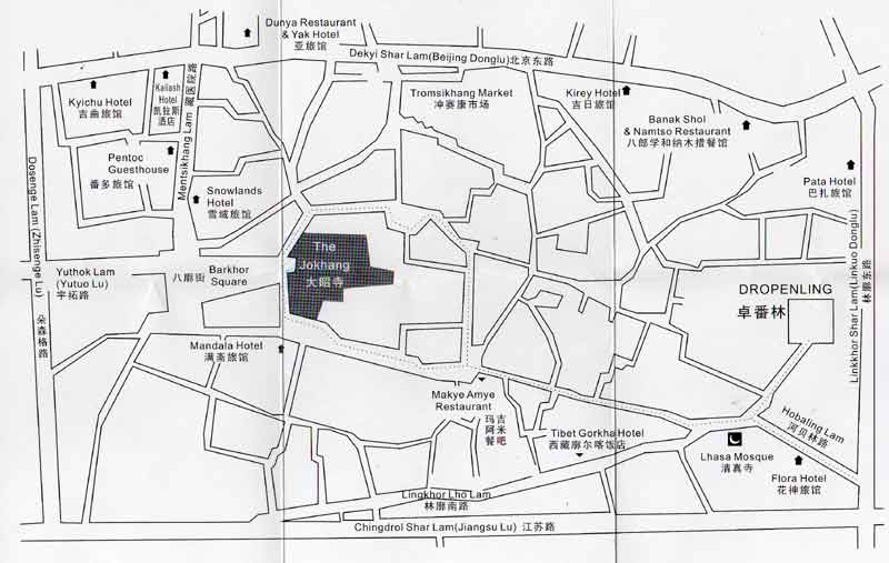 Der Jokhang (Jobo Khang = Haus des Herrn) ist ein Tempel inmitten der Altstadt. Zusammen mit dem Potala Palast und dem Norbulingka Palast gehört er als "Historisches Ensemble Potala-Palast in Lhasa" zum UNESCO Weltkulturerbe . Für die Tibeter stellt der Tempel den Mittelpunkt Tibets dar. Jeder Tibeter sollte mindestens einmal in seinem Leben hierher gepilgert sein. Der Jokhang enthält heute die heiligste Statue der Tibeter, den Jobo Shakyamuni. Er soll der Legende nach zu Lebzeiten des historischen Buddha nach seinem Abbbild geschaffen worden sein, andere Quellen behaupten, die Figur habe sich selbst erschaffen. Diese Statue ist das Herzstück der tibetischen Kultur. Die Buddhahalle, das Hauptgebäude der Anlage, ist viergeschossig und von einem Wandelgang umgeben. Das mit vergoldeten Bronzeziegeln gedeckte Dach ist mit einem von Hirschen flankierten Dharma-Rad geschmückt. In der Haupthalle befinden sich unter anderem die vergoldete Statue des Shakyamuni sowie Statuen von Songtsen Gampo und seinen berühmten Frauen, der chinesischen Wen Cheng und der nepalesischen Bhrikuti. Ursprünglich stand am selben Platz eine Statue (Jobo Mikyo Dorje), die die nepalesische Prinzessin Bhrikuti mitgebracht hatte. Sie war wesentlich am Bau des Tempels beteiligt und setzte viele nepalesische Künstler dafür ein. Später wurde der Jobo Shakyamuni aus dem Rimoche (ein anderer Tempel in der Nähe) in den Jokhang gebracht, und der Jobo Mikyo Dorje kam in den Rimoche. Man wollte so den Jokhang vor der Zerstörung durch die Chinesen schützen. Geschichte des Tempels:Der Tempel wurde im Jahre 639 unter König Songtsen Gampo, Prinzessin Bhrikuti und Prinzessin Wen Cheng errichtet. Man sagt, daß es 3 Jahre gedauert hat, da der Tempel auf einem See errichtet und die Erde von einer weißen Ziege herbeigetragen wurde. Im 9. Jh. wurde der Jokhang unter dem Bön-Herrscher Langdarma geschlossen. An die Tür wurde das Bild eines saufenden Mönchs gemalt. Buddhisten wurden unterdrückt. Im 11. Jh. etablierte Atisha den Buddhismus in Tibet von Neuem. Wiedereröffnung des Jokhang. Im 12. Jh. Restaurierung. Im 15. Jahrhundert wurde er, u. a. von Tsongkapa, wiederholt ausgebaut. Er wurde zum Zentrum des wichtigen Mönlam-Festes (Großes Gebet) und bedeckt nun eine Fläche von mehr als 25.000 m². 1959: Verbot religiöser Zeremonier durch Chinesen. |